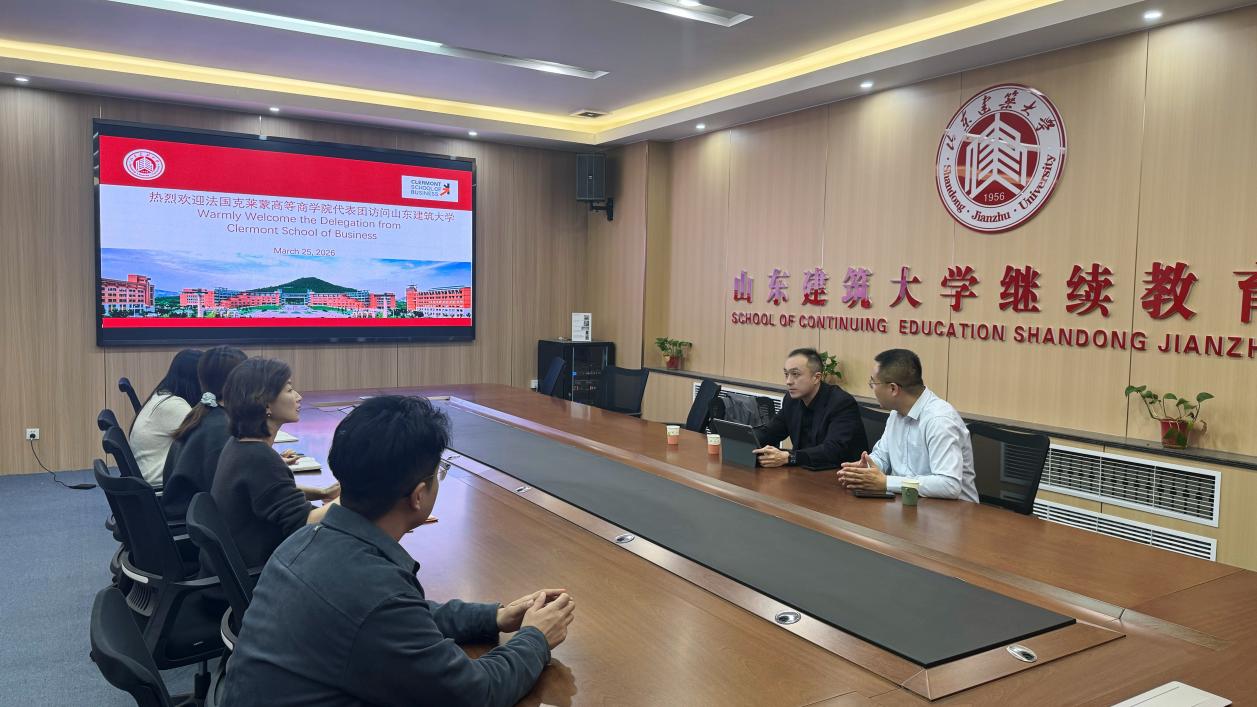 2026年3月25日,法国克莱蒙高等商学院亚洲区域代表Joseph Wong、深圳校区执行校长黄愐一行访问山东建筑大学。山东建筑大学继续教育学院学术副院长、留学服务中心主任丁静热情接待了来访嘉宾,双方围绕中外合作办学项目开展深入交流。